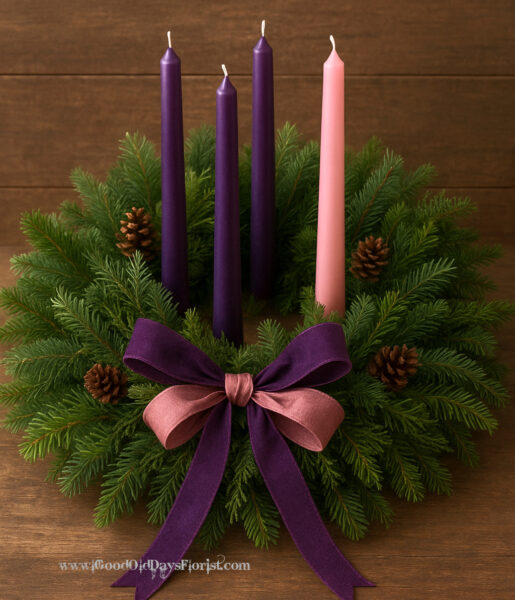 Historically, ancient European cultures also made candled wreaths to give hope & brightness during the dark winter months at the winter solstice.   Credit is given to an 1839 German school professor for the modern-day Advent wreath by taking a wagon wheel with 24 candles and 4 white for the Advent weekends to help the children count down the days. This eventually was adopted into a symbolism of more reverence in Europe & America to mean the coming of our light meaning Jesus, with just 4 candles surrounded by a circle of evergreens.   The evergreens for their longevity  (his never ending love)  the 3 purple candles for hope, penance, and peace, while the pink for joy.