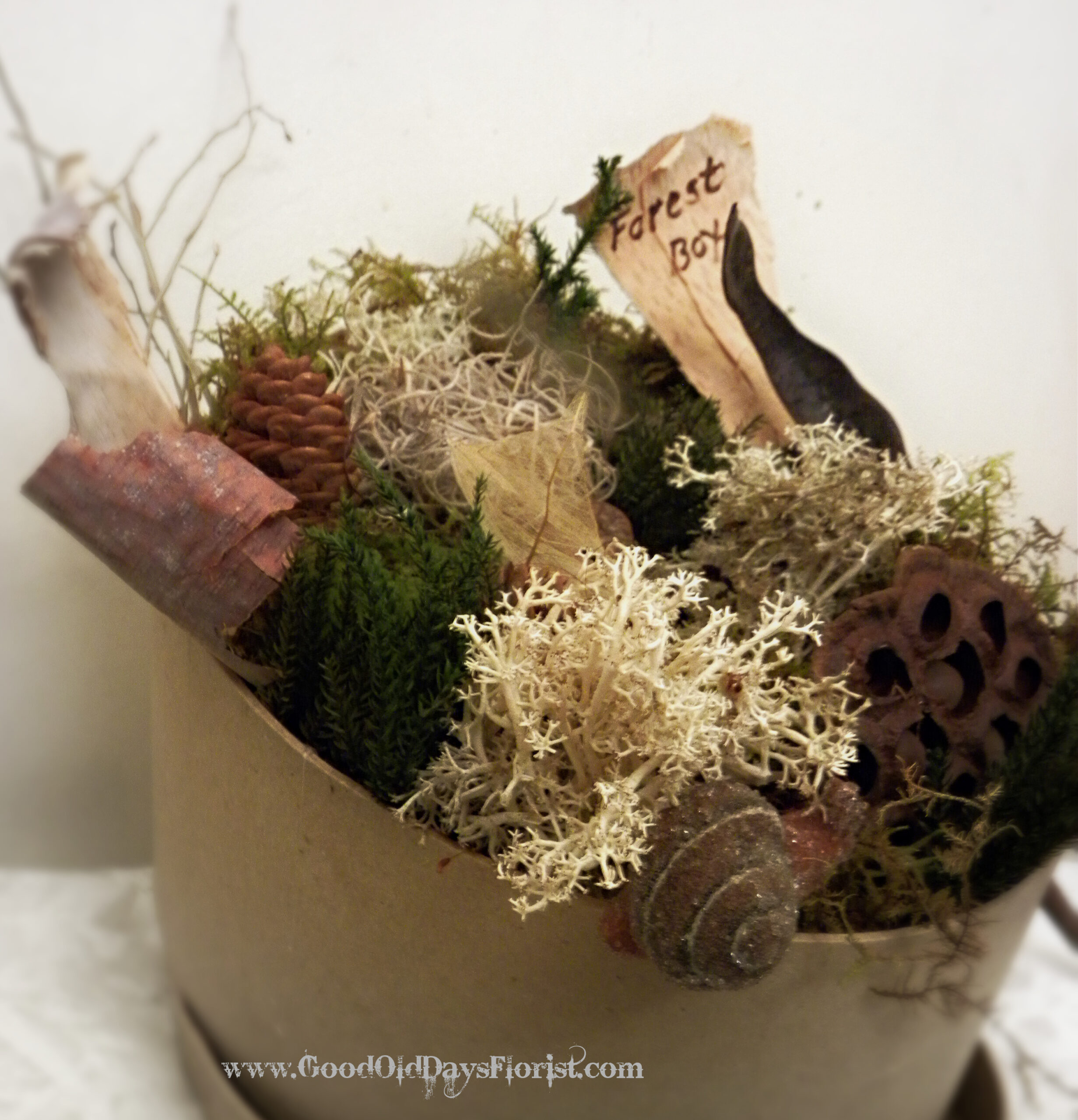 A gathering of items for the woods lover and for forest bathing. A recycled content, box holds treasures of all kind of aroma and finds of pods & mosses, nested egg, feathers, skelton leaves, bark, and more as a faux snail hides. The lid can contain your box secrets or leave it open for daily bathing.