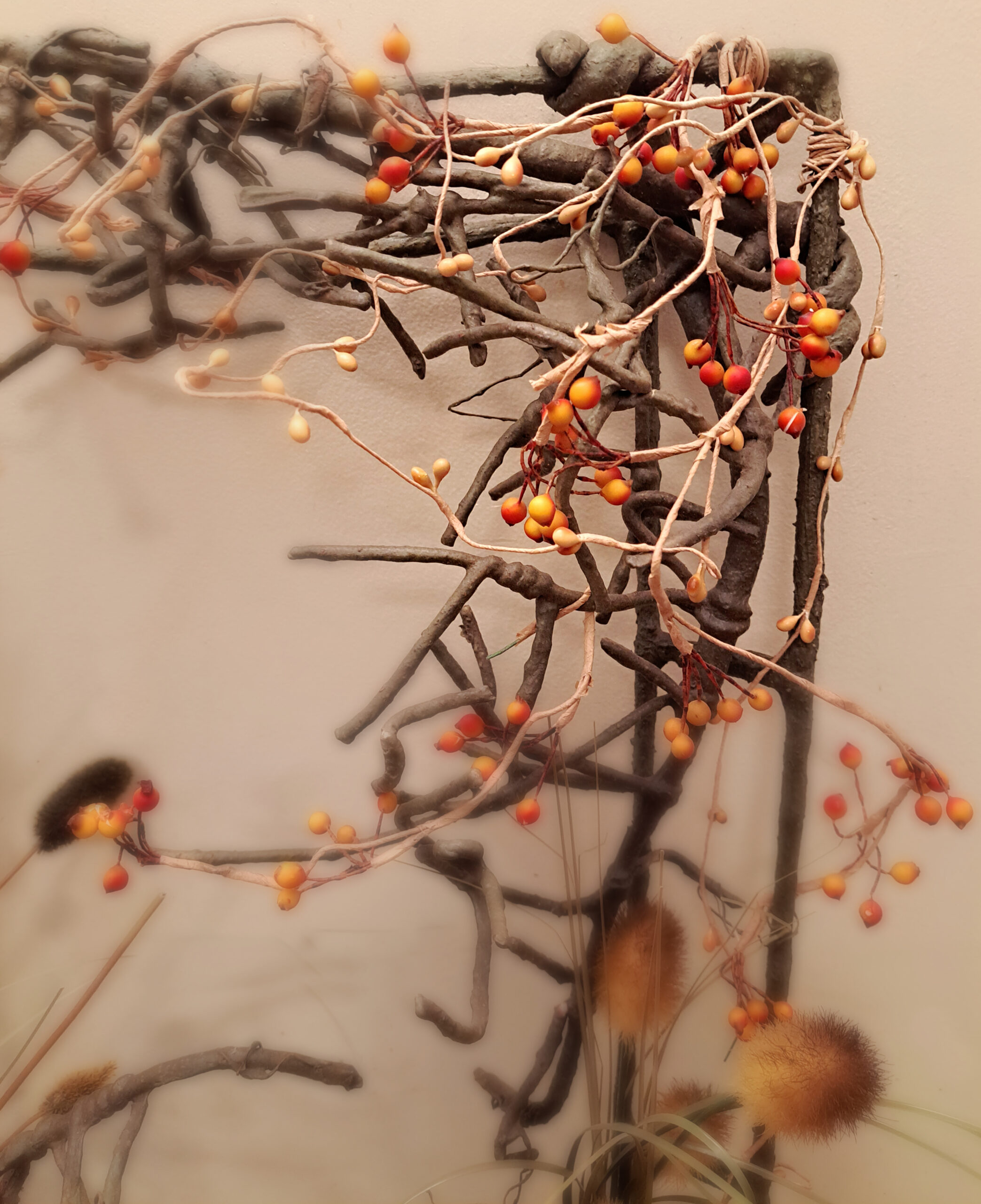 A large, coated wire frame in a rectangle freeform to showcase a scene at the pond.  A pair of birds snuggle among the berried vines, cattails & pods.  A wreath of a different feather for dining area or den-anywhere a bit of nature is needed.  This is a one only, made on this great vintage frame and you will not see another.