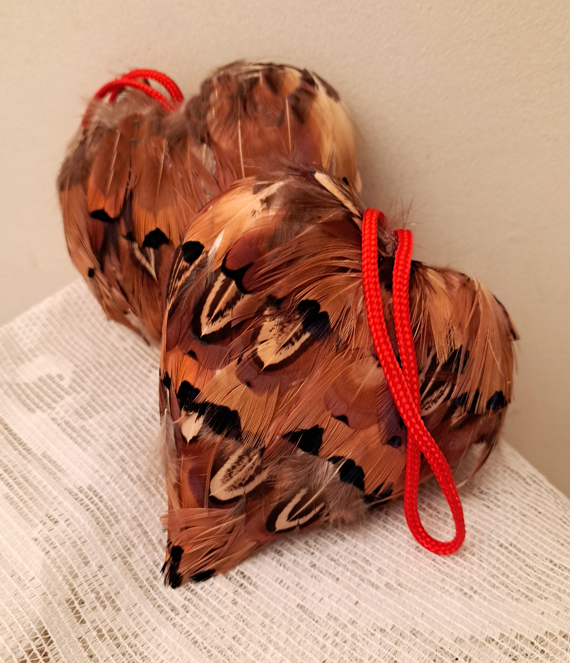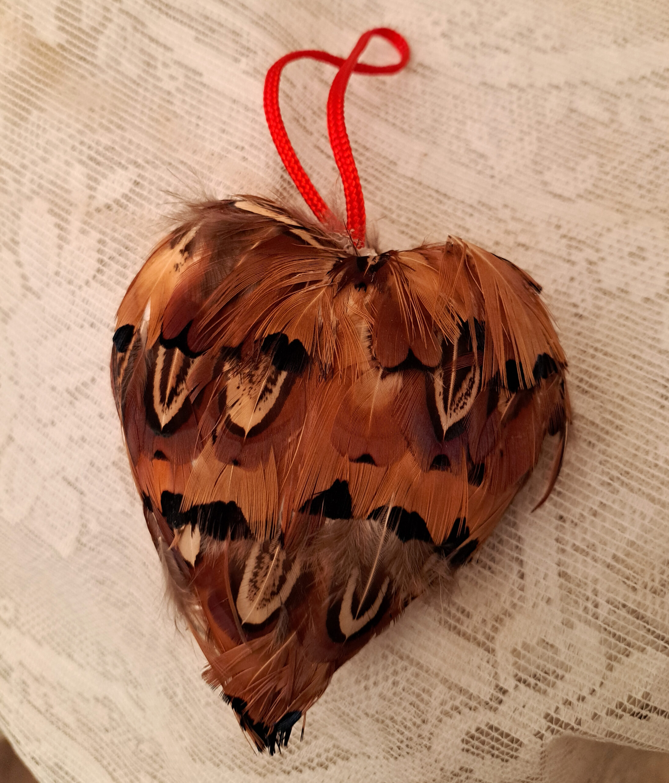 A vintage piece covered in the softest feathers with a twisted silk hang loop for the sweetest keepsake.