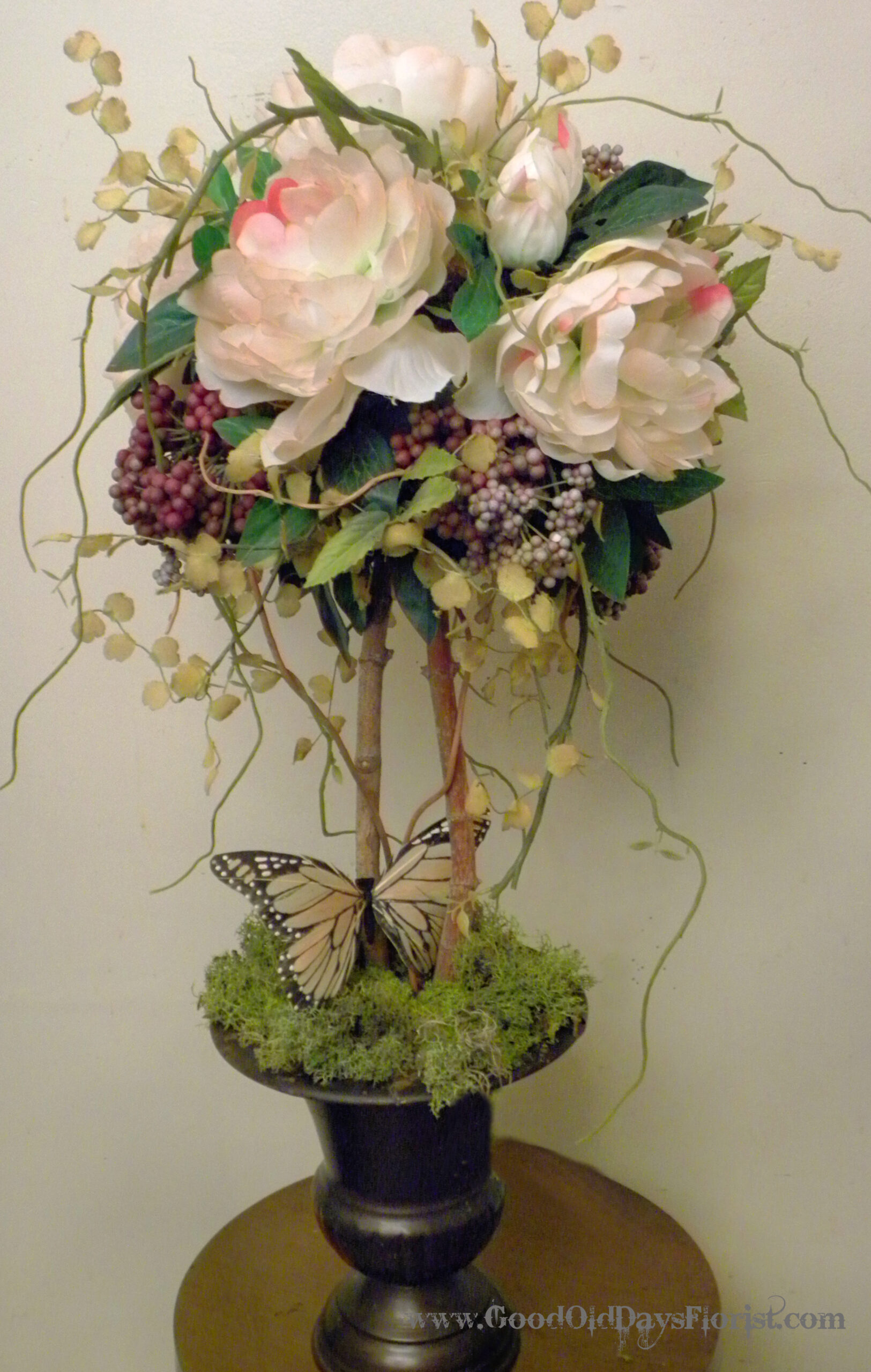A rustic metal urn holds pale pinky peachy peonies in a tall topiary tree design. Vintage cloth. maidenhair ferns, vine tendrils, and berry clusters add just the right accents for just the right amount of elegant wildness. And then the butterfly in the preserved reindeer moss…..